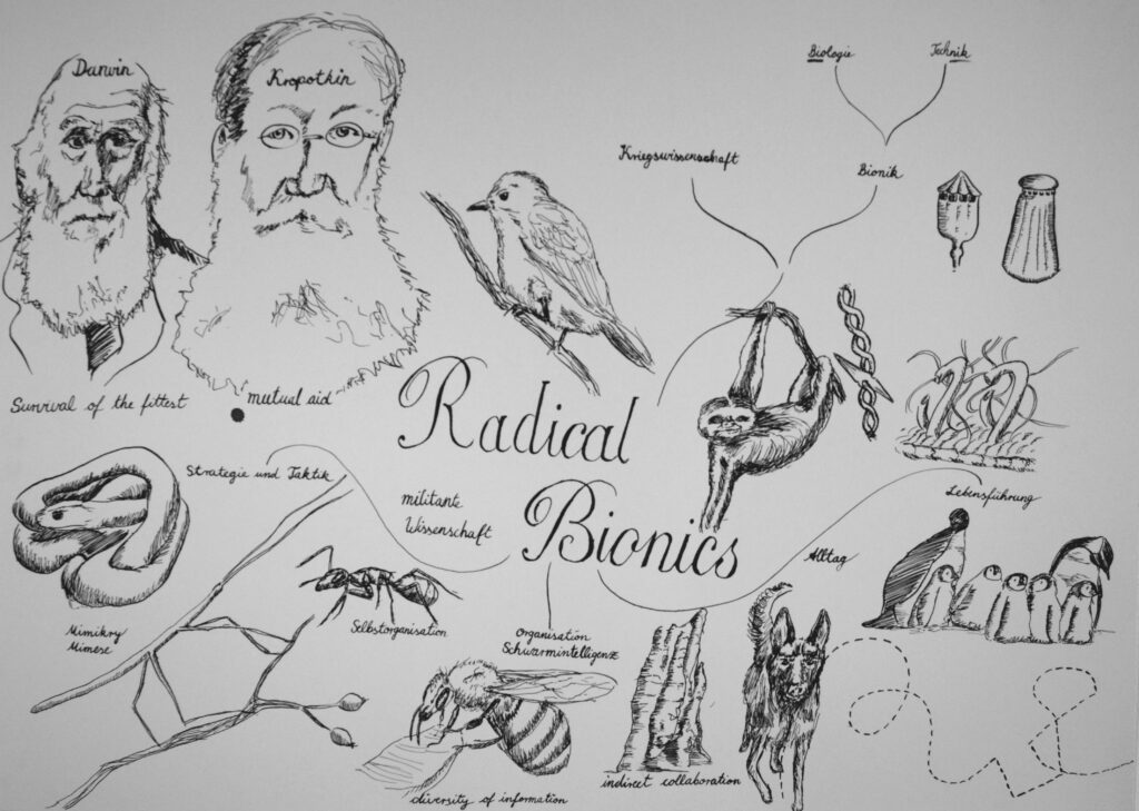 Die künstlerische Wissenschaft der radical bionics erforscht, wie sich Verhaltensweisen und Überlebensstrategien aus der Tier- und Pflanzenwelt für eine besseres menschliches Zusammenleben nutzen lassen. Aus der künstlerischen Forschung entstanden zwei Performances: Radcical Bionics – Eine Einführung widmet sich u.a. tierischen Strategien der Tarnung und Täuschung, der Schwarmintelligenz von Bienen und Ameisen und dem Faultier als Ikone des Wenig-Tuns. Die Politik der Pflanzen – entstanden als Auftragsarbeit für den Palmengarten in Frankfurt am Main – feiert die Kokosnuss als Botschafter globaler Migration, widmet sich in Anlehnung an Gilles Deleuze pflanzlicher Strategien des Mimikry und der raffinierten Aufmerskamkeitspolitik des Aronstabs. Die aus dem Geist der radical bionics entstande Installation „I will be hanging around here…“ wurde 2010/2011 als Teil der Ausstellung New Frankfurt Internationals – Stories and Stages im Frankfurter Kunstverein gezeigt.